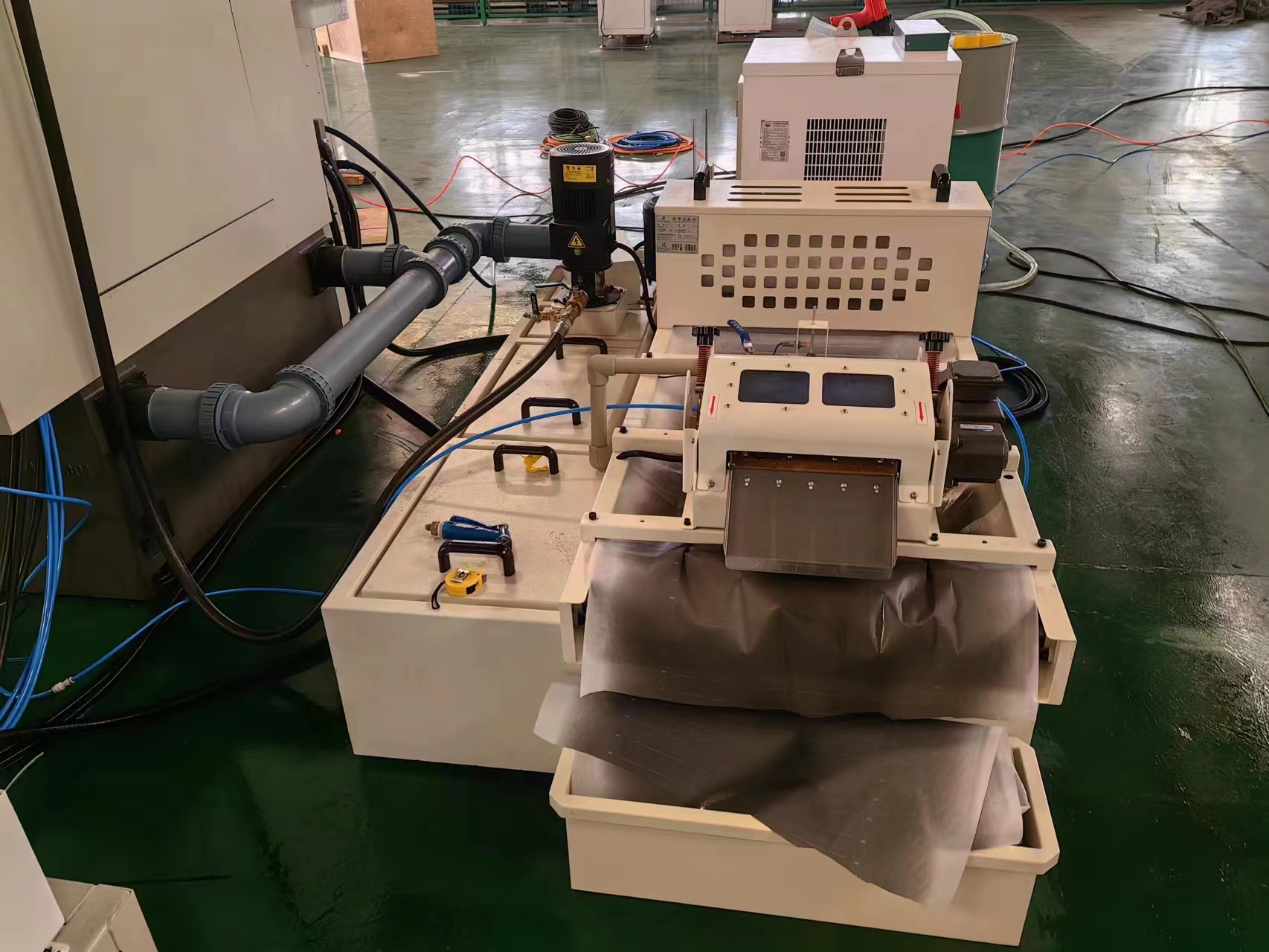 从用户机床加工产生的脏切削液直接流入下面承接的回液箱内,回液箱上安装有回液泵,回液泵将脏液连屑一起抽出、向上打入架空回液管,通过管道首先送入磁性分离装置作做第一级预分离。脏液中大部分屑杂质被分离出来、落入接渣车;而经过预分离后的脏液向下流入真空过滤装置的下箱体(脏液箱)内。随后过滤装置的真空过滤泵将经过真空纸带过滤后的干净切削液抽出、送入上水箱(净液箱)内,由供液泵以一定的压力送入架空供液管道供给用户机床重新使用。过滤出来的滤渣与脏滤纸一起由刮板自动排出。
